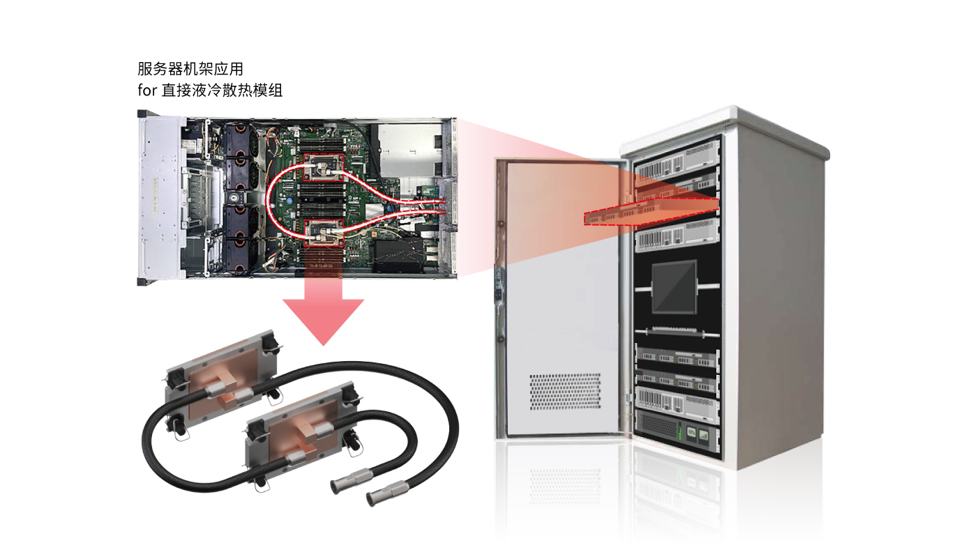 SUNON建準研發出多元液冷散熱系統和組成組件,包含各式直接液冷散熱方案、機柜級熱交換器(RDHx)和水路分配單元(RPU)等模塊,其中開回路式直接液冷散熱模塊(Open Loop Direct Liquid Cooling Module)已成功導入多種機架服務器 (Rack Server),依系統結構客制化及優化設計液冷系統的熱接觸面、水管曲度、冷卻液等結構,可符合服務器系統的冷卻需求如: