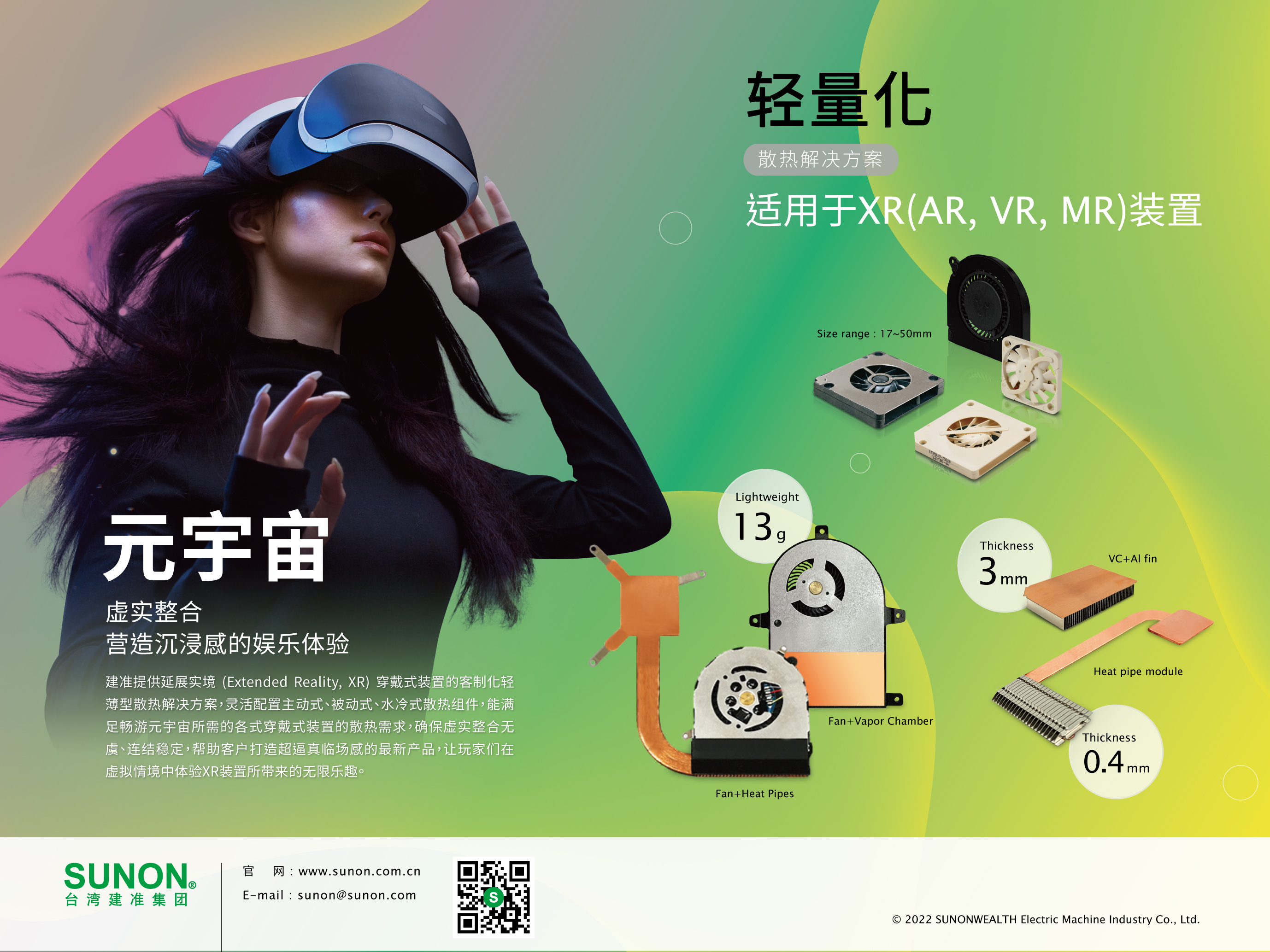 SUNON身為散熱解決方案的先驅(qū),深知XR裝置對長效均溫或快速驅(qū)散熱源的要求,是提高游戲滿意度的關鍵成功因素,且能讓元宇宙玩家有更沉浸的真實感受,SUNON能為各種尺寸的XR裝置客制化高效輕薄的散熱方案,同時配合應用SUNON為連結(jié)虛擬現(xiàn)實平臺設備如游戲機、電競計算機打造的最佳散熱解決方案,不論是在游戲運作效能的維護還是產(chǎn)品壽命的延續(xù),SUNON散熱解決方案都是客戶優(yōu)質(zhì)的選擇。