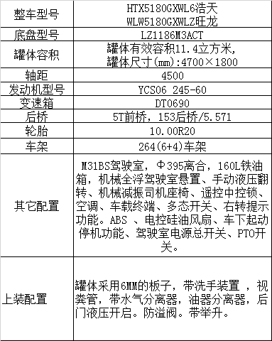 玉柴245馬力(YCS06 245-60),DT0690(可選裝法士特8檔變速箱),Φ395離合,264(6+4)車架,160L鐵油箱,10.00R20,機械全浮駕駛室懸置、手動液壓翻轉、機械減振司機座椅、遙控中控鎖、空調、車載終端、多態開關、右轉提示功能。ABS 、電控硅油風扇、車下起動停機功能、駕駛室電源總開關、PTO開關。
