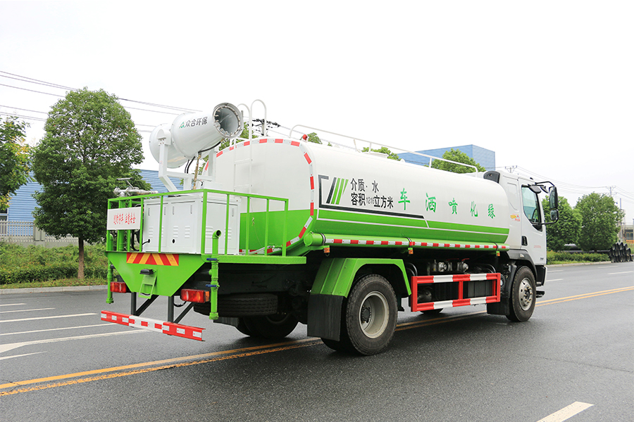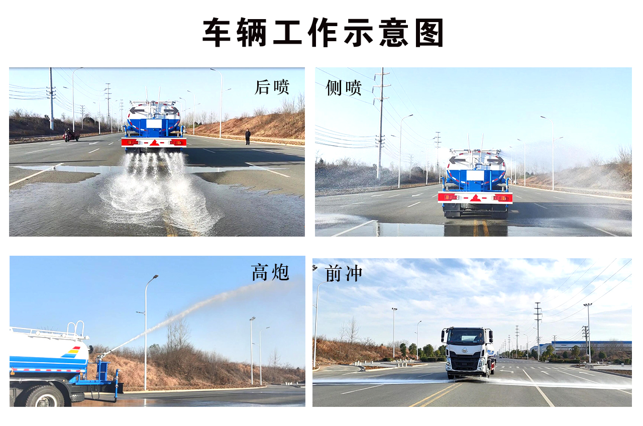 罐體采用 4mm 厚武鋼專用容積板制作,實(shí)際標(biāo)準(zhǔn)容積 12 立方-15 立方(常規(guī) 12 立方),罐內(nèi)隔板具有防波作用,以減低汽車行駛時(shí)罐體液體的沖擊。泵進(jìn)泵出,消防栓接口,前沖、后灑、側(cè)噴、后工作平臺(tái)帶綠化水炮,垂直吸程≧7 米,灑水寬度≧14 米,射程≧28 米,引水時(shí)間<5min,流量 90m3/h。自流閥、濾網(wǎng)、帶自吸自排功能。兩根等長(zhǎng)輸水管,金屬漆,其余標(biāo)配。霧炮灑水車可選裝:30 米、40 米、50 米等以上的霧炮機(jī)。