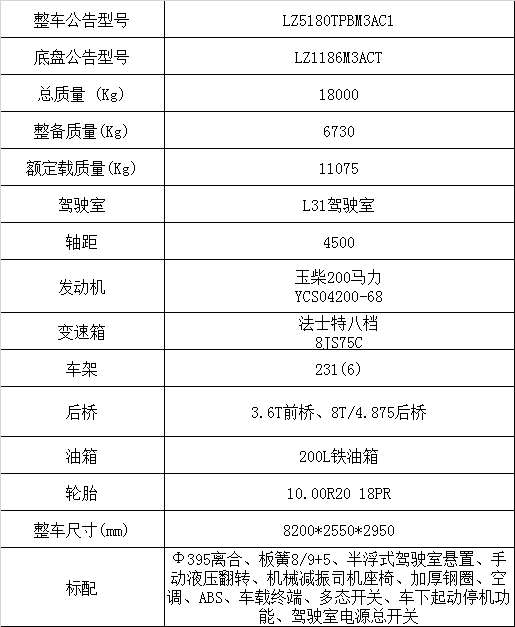 半浮式駕駛室懸置,發動機YCS04200-68,3.6T前橋、8T/4.875后橋,8JS75C,板簧8/9+5,231(6)局部加強車架,200L油箱,10.00R20,手動液壓翻轉、夾層玻璃、電動玻璃升降器、機械減震司機座椅、空調、ABS、車載終端,ABS、免維護電池、車下起動停機功能、駕駛室電源總開關、PTO開關
