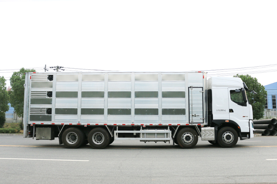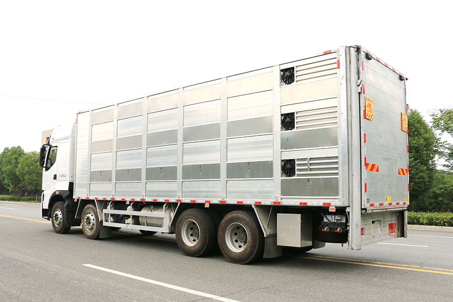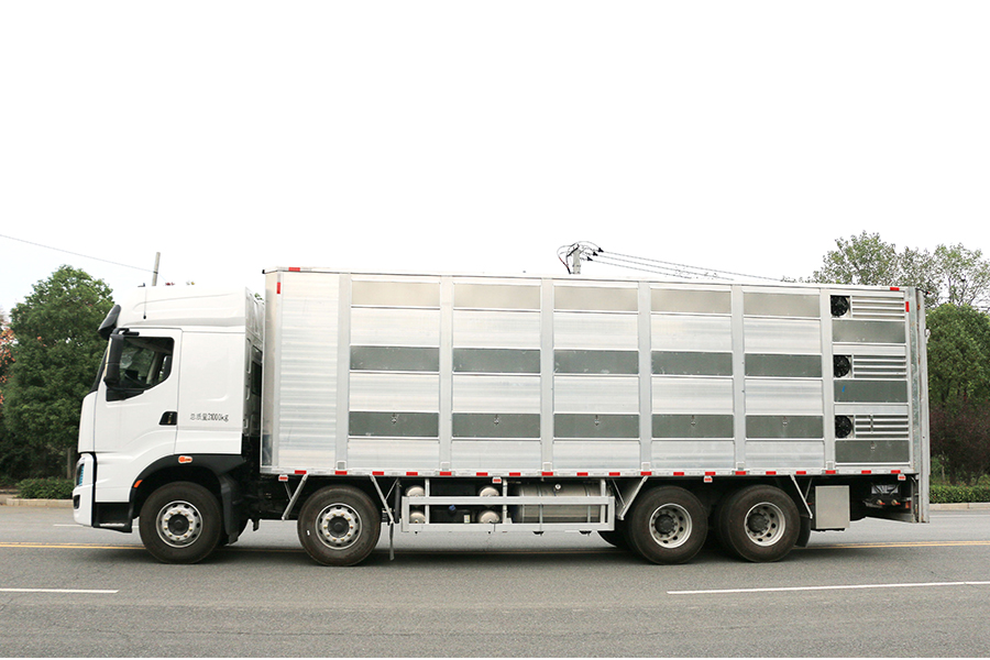 全鋁車身,三層,混合隔倉,可開合側窗,高轉速防水通風排氣扇,機組,噴淋,監控,垂直升降尾板,空氣過濾,裝豬數量達到1100頭/7公斤