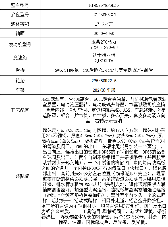 發(fā)動機(jī)YCS06 270-60,2*5.5T前橋,440后橋/4.444/加寬制動器/油潤滑,8JS105TA,Ф430離合,282(8)車架,600L鋁合金油箱,295/80R22.5,前機(jī)械后氣囊駕駛室懸置、電動液壓翻轉(zhuǎn)、電動玻璃升降器、氣囊減震司機(jī)座椅、全新內(nèi)飾、自動空調(diào)、定速巡航系統(tǒng)、ABS、車載終端、外部遮陽罩、鋁合金貯氣筒、中控鎖、多態(tài)開關(guān)、真皮多功能方向盤、右轉(zhuǎn)提示音響