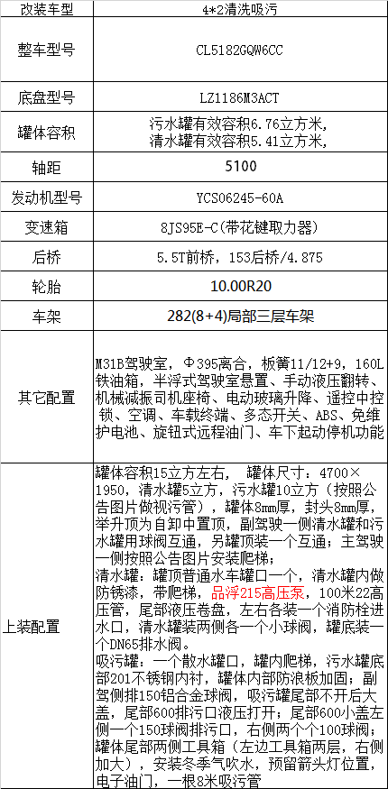 吸污車專用部分由取力器、傳動軸、真空吸污泵、壓力罐體、液壓部分,管網系統、真空壓力表、視糞窗、洗手裝置等組成,隨車配置大功率真空吸污泵和優質液壓系統,罐體封頭一次壓鑄成型、罐體可后開、雙頂自卸。罐內污物可通過后蓋直接傾倒,具有真空度高(比吸糞車的吸力更大)、噸位大、效率高、用途更廣泛的特點。主要用于清洗城市下水道,管道的沉積物,死角泥溝的疏通,也可用于清洗工業排液管道,壁面等,并可兼作灑水,運水和沖公路用,緊急時可用于救火。