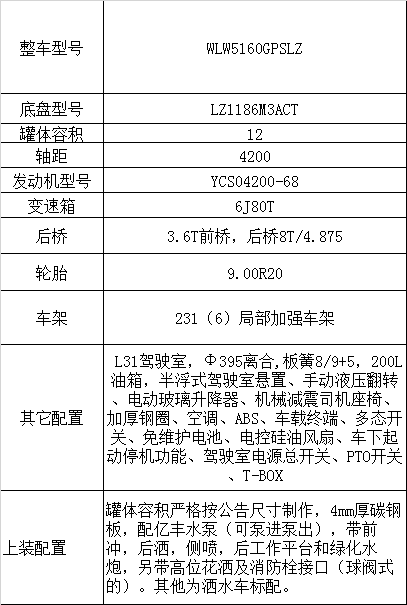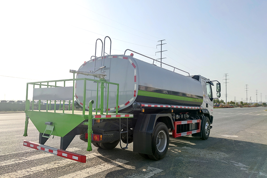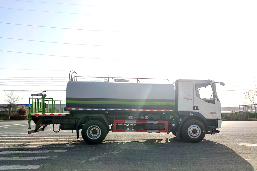 罐體采用 4mm 厚武鋼專用容積板制作,實際標(biāo)準(zhǔn)容積 12 立方-15 立方(常規(guī) 12 立方),罐內(nèi)隔板具有防波作用,以減低汽車行駛時罐體液體的沖擊。泵進泵出,消防栓接口,前沖、后灑、側(cè)噴、后工作平臺帶綠化水炮,垂直吸程≧7 米,灑水寬度≧14 米,射程≧28 米,引水時間<5min,流量 90m3/h。自流閥、濾網(wǎng)、帶自吸自排功能。兩根等長輸水管,金屬漆,其余標(biāo)配。霧炮灑水車可選裝:30 米、40 米、50 米等以上的霧炮機。