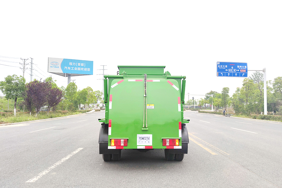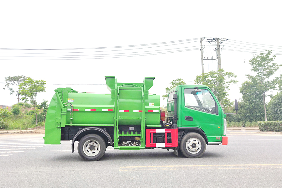餐廚垃圾車裝載由垃圾桶提升系統完成,該系統具有垃圾桶鎖止結構,裝卸安全可靠。垃圾桶與垃圾投入口銜接好,保證裝卸過程中餐廚垃圾不溢撒、不遺漏。垃圾投入口與推板之間有足夠距離,推板與罐體內表面設有密封裝置,避免餐廚垃圾投入過程及分離過程中溢到推板后方。液壓系統由泵、液壓閥和順序閥以及各種功能的液壓油缸、高低壓管路組成。關鍵部件可選用原裝進口,保證產品工作可靠、安全。