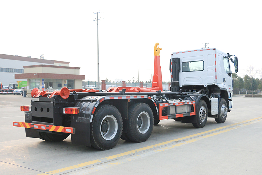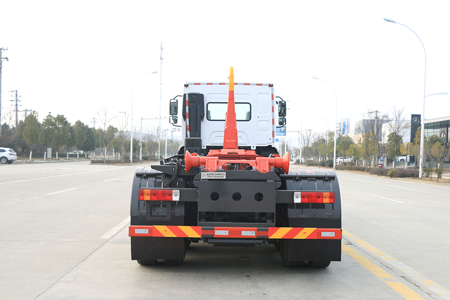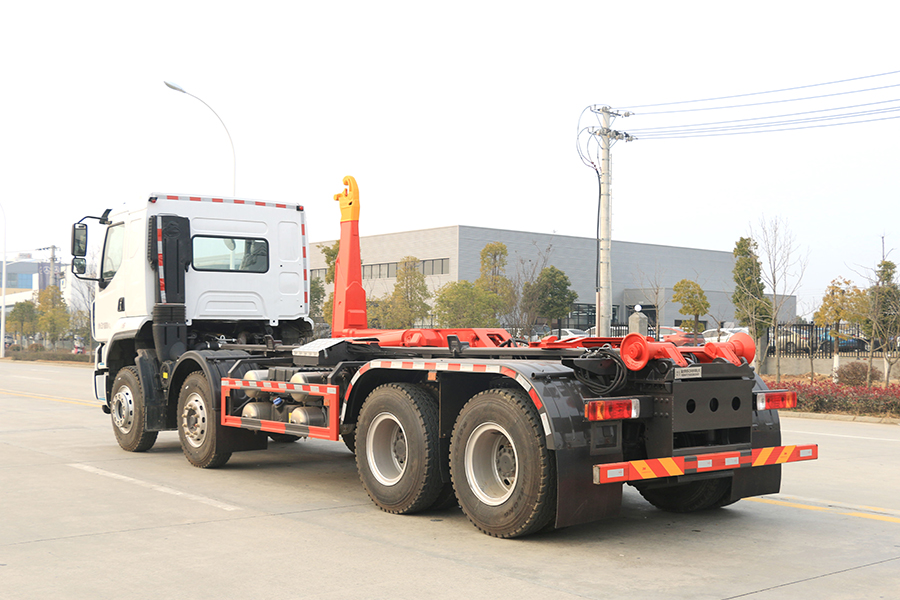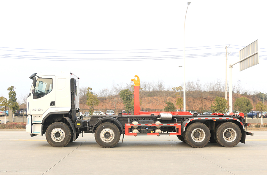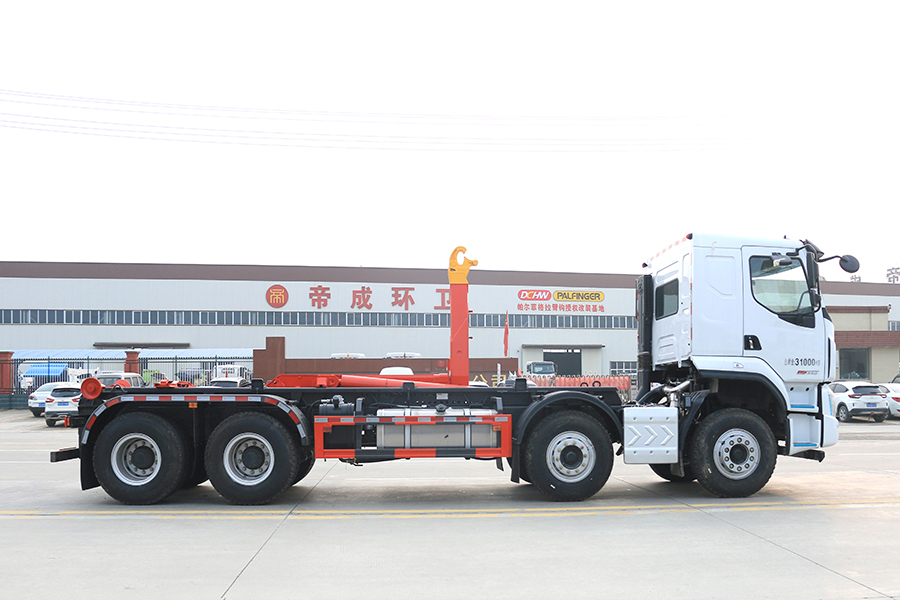 帶自卸功能,液壓操作,方便傾倒。該車的箱體部分完全由液壓系統來控制,在平日里可將車載垃圾箱放置到各個垃圾收集站,待垃圾收集滿后,該車可直接開赴至垃圾站,通過液壓系統的操控,可將垃圾車后座上加裝的勾臂放下,掛住站內垃圾箱前端的連接點,將垃圾箱拉至車體的后座上,此時即可啟動車輛,將垃圾運送至垃圾處理站內,進行自卸式傾倒。該車最主要的優點就是可一車配多斗,一輛車就可以維持數個垃圾收集站的運轉,效率高,且箱體為密封式設計,不會造成二次污染。