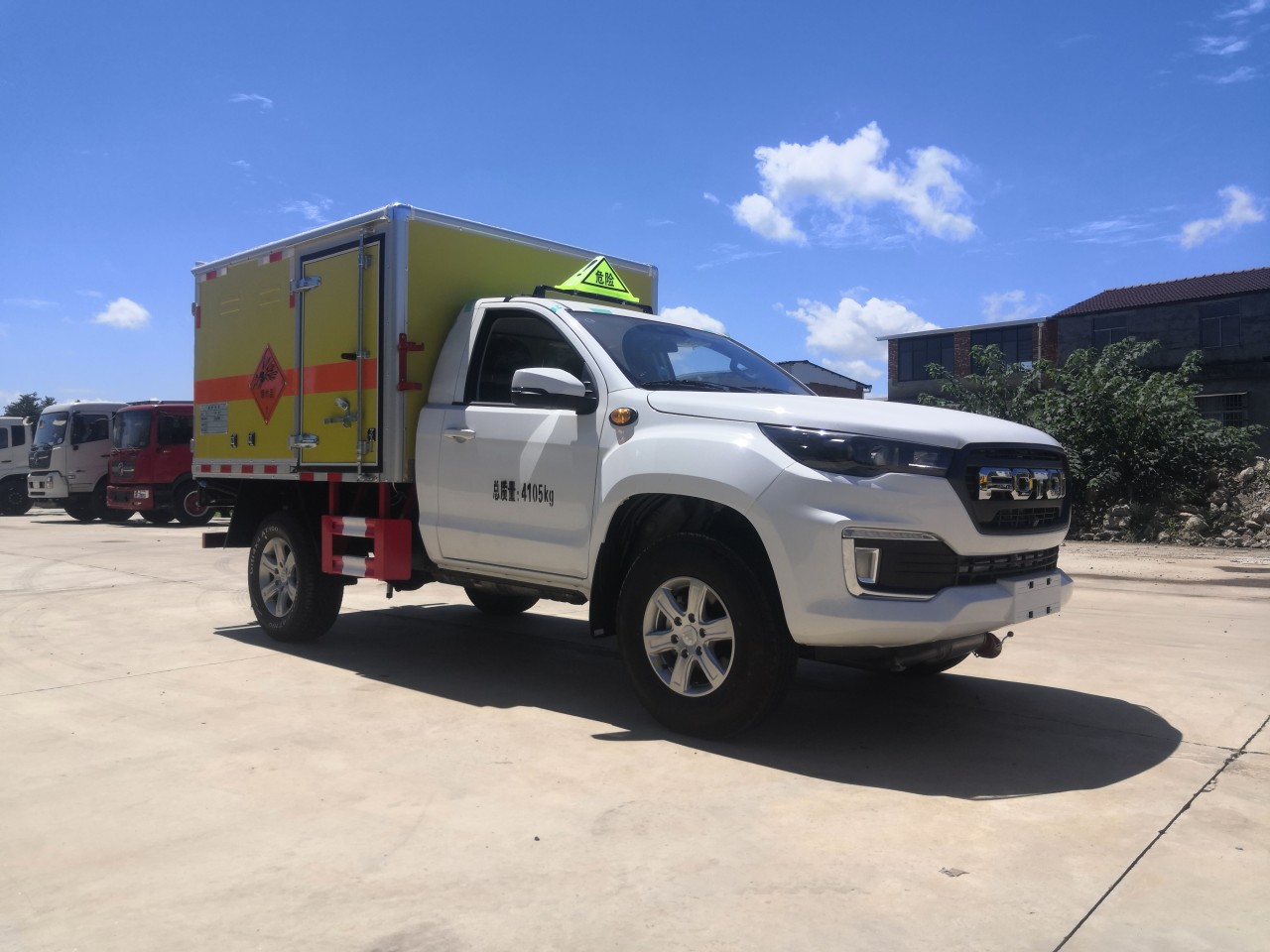 福田重載法規藍牌皮卡底盤,總質量4105kg,3110軸距,單排駕駛室,歐康柴油2.5T發動機 ,4*4驅動,前雙叉臂式結構獨立懸架+后鋼板彈簧非獨立懸架,前盤后鼓,遠近光一體透鏡大燈,有晝行燈,側轉向燈(重載法規 要求),離地間隙210mm,BA剎車輔助 ,前7.00R16后265/65R17輪胎,多功能方向盤、電動空調,藍牙、無側踏板 ,76L油箱,8吋屏幕MP5 ,4G-T-BOX,一鍵啟動
